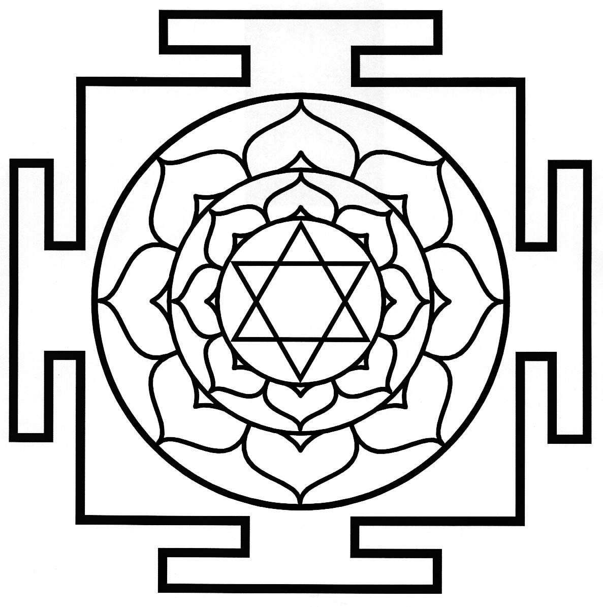 Al centro dello yantra di Bhuvaneshwari si trova il bindu immaginario (bianco) o le lettere del mantra specifico di Bhuvaneshwari. Segue un triangolo rivolto verso il basso che rappresenta l’energia (l’aspetto femminile nella manifestazione, o Śakti) e un triangolo rivolto verso l’alto che rappresenta la coscienza (o l’aspetto maschile nella manifestazione, o Śiva). Sovrapponendo i due triangoli si forma la stella a sei punte. Lo yantra presenta inoltre 8 petali di loto distribuiti su un cerchio e altri 8 petali di loto collocati su un cerchio concentrico di diametro maggiore, entrambi incorniciati in un quadrato con quattro porte (aperture). In termini di divinità, lo yantra della Grande Forza Bhuvaneshwari rivela otto divinità (dei e dee) che occupano l’interno degli otto petali; altre quattro divinità siedono sul pericarpo all’interno del loto. Una coppia di dei e dee è posta su ciascuno dei sei punti dei triangoli. Altre otto dee sono presenti alle otto estremità dei petali. Altre otto śakti (divinità femminili) si trovano negli spazi tra i petali. Ciascuno degli altri otto petali è governato da una divinità. Quattro divinità sorvegliano le quattro porte; altre quattro divinità sorvegliano i quattro angoli della piazza. L’area centrale dello yantra è generalmente dominata dalle divinità femminili, mentre il perimetro è dominio delle divinità maschili. Il Bindu Śiva-Śakti centrale è circondato da tutte queste divinità. L’adoratore di questa forza cosmica adorerà tutte queste divinità nello yantra.