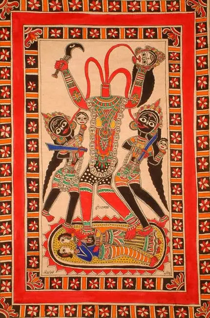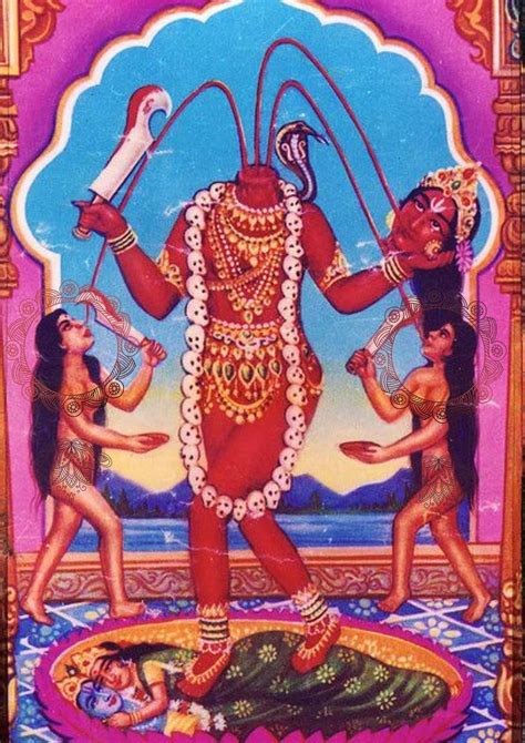 CHINNAMASTA indossa il cordone sacro intorno ai fianchi, che rappresenta un serpente, e i suoi seni hanno la forma di un fulmine. È adornata con numerosi fiori e ha una singola pietra preziosa attaccata ad un serpente nella zona della testa. La dea ha tre occhi spalancati che emanano una grande luce. Ai suoi lati, CHINNAMASTA è accompagnata da altre due dee, i cui nomi sono DAKINI e VARNINI. Danza sopra i corpi uniti in fusione amorosa del dio dell’Amore (KAMA) e della sua consorte (RATI). In alcune rappresentazioni tradizionali, il loro posto è preso rispettivamente da KRISHNA e RADHA.