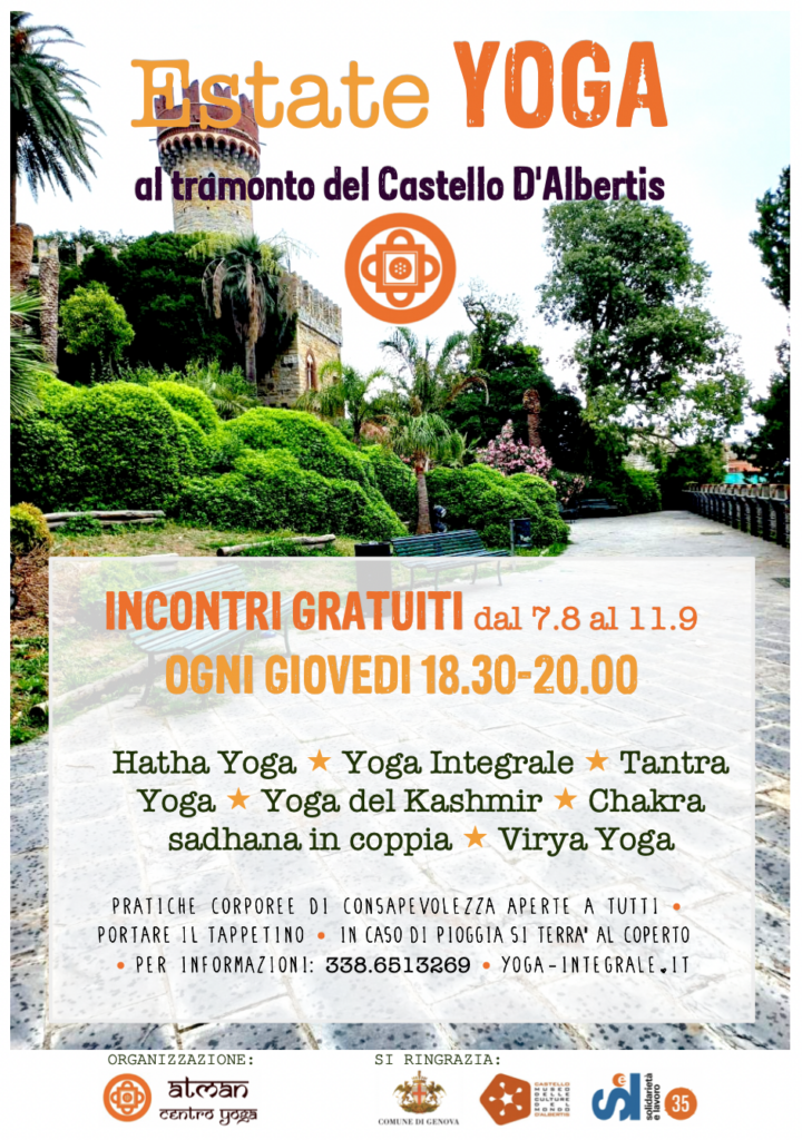 Ad Agosto terminano i nostri corsi, ma ripartono gli appuntamenti settimanali gratuiti di Yoga all’aperto, che anche quest’anno avremo il piacere e l’onore di tenere al Castello D’Albertis, aperti a tutti.